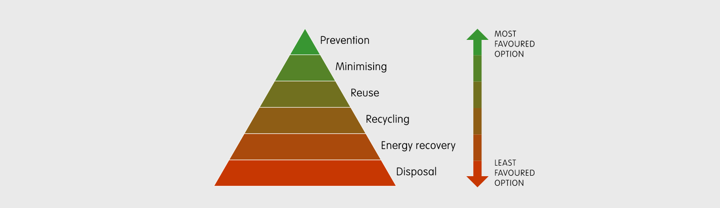 Illustration of the waste hierarchy which promotes the prevention of waste ahead of recycling and recovery.