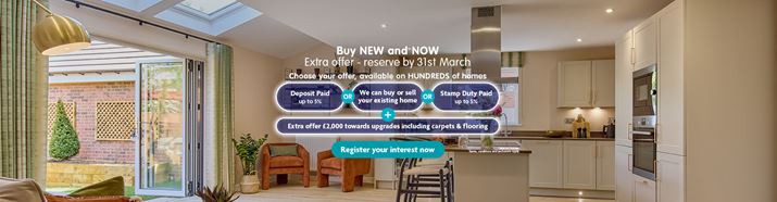 We’re here to turn your ‘one day’ dreams into ‘right now’ reality. On hundreds of homes, you can choose from up to 5% towards your deposit, or Stamp Duty*, or we can buy or sell your existing home with our Part Exchange† or Assisted Move option^. Plus, an additional £2,000 towards upgrades if you reserve by 31st March‡. So, get moving. Register your interest today. Terms and conditions apply.